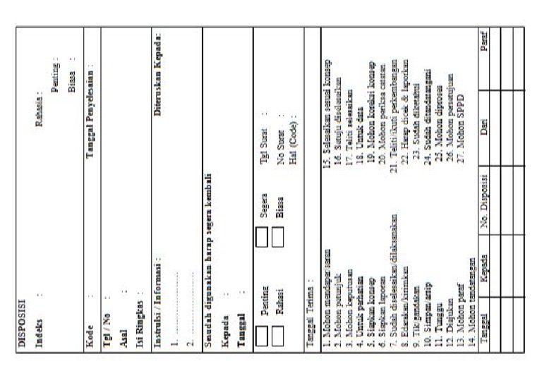 Lembar disposisi adalah lembar isian untuk mencatat instruksi dari pimpinan berkaitan dengan proses tindak lanjut dari surat yang diterima dari pihak lain. Menerima kembali surat, kartu kendali iii dan lembar disposisi i dan ii yang telah diisi oleh pimpinan unit pengolah. Setelah mengikuti semua cara membuat siup di atas, kamu tinggal menunggu hingga surat izin selesai dibuat. Tujuan pembuatan disposisi ialah agar staf dapat menindaklanjuti atau menyelesaikan suatu urusan atau surat masuk sesuai dengan yang dikehendaki oleh pimpinan. Lembar disposisi adalah lembar isian untuk mencatat instruksi dari pimpinan berkaitan dengan proses tindak lanjut dari surat yang diterima dari pihak lain.